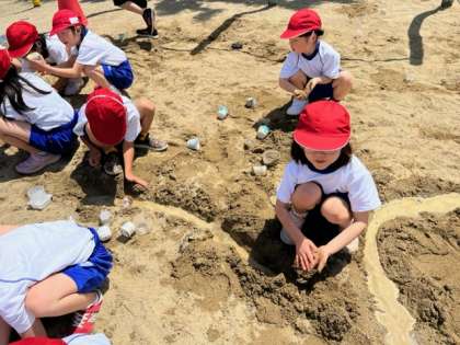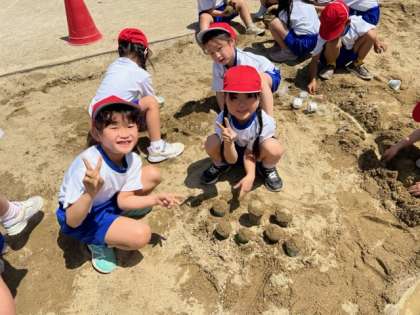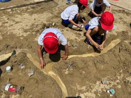 カップと使ってアイスやカップケーキをつくったり、砂の道をつくり水を流して川にしてみたり…それぞれがいろいろなものを作っていました。