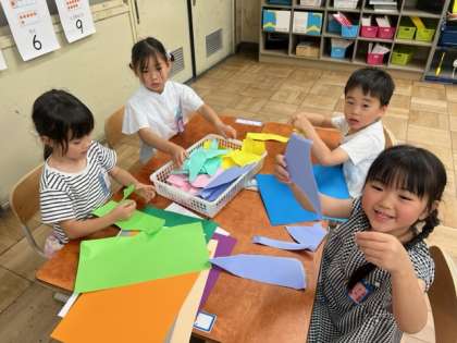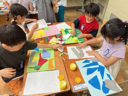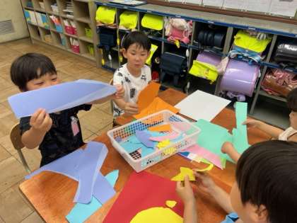 色画用紙をいろいろな形にやぶり、そのやぶいた形が何にみえるかを考えながら、作品を作っていきます。