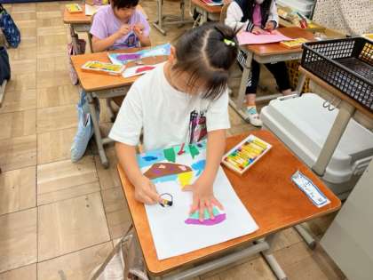 今日はその作品にクレパスで絵を付けたし、完成させました。