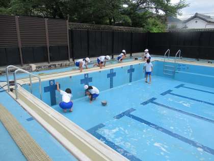 たわしを使って、プールサイドの溝やプールの中をこすって、きれいにしました。