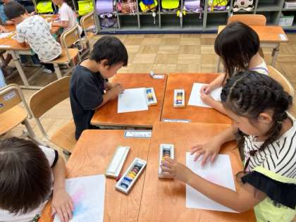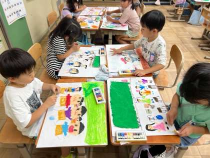 この間の図工では、入学してから今までを思い返し、学校での楽しかった出来事を絵にあらわしました。