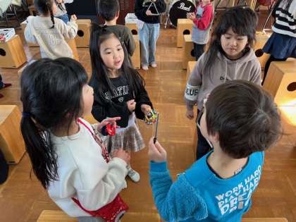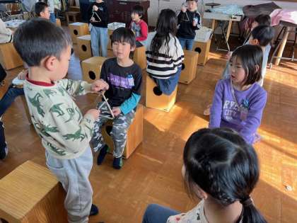 グループでカスタネット・タンブリン・トライアングル・すずに分かれて、リズムを考えて演奏する練習をしました。