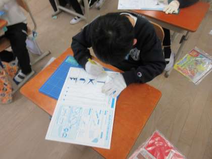 カッターを使用するので、安全に気をつけて学習に取り組みました。