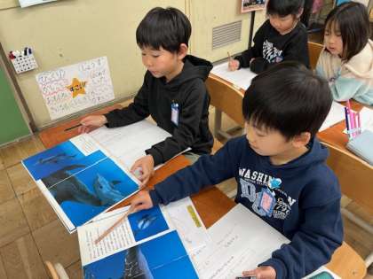 教科書の動物だけでなく、自分が調べたい動物の赤ちゃんについても調べて赤ちゃんカードをつくっています。