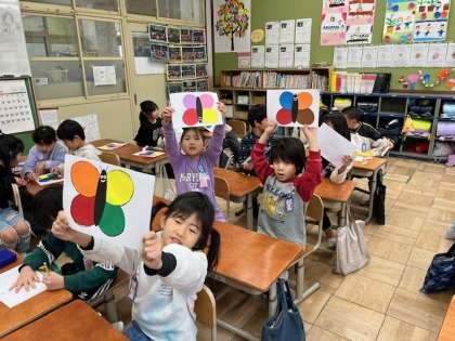 色の言い方を学習し、自分の好きな色を選んでちょうちょを作りました。