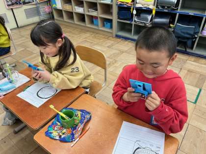 歯ブラシの使い方や磨き残しが多いところなど、歯をピカピカにするための方法を、実際に歯磨きしながら学びました。