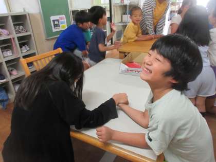 【1年】お昼休みに 公開日 2024/06/04 更新日 2024/06/04 学校の様子 昼休みに6年生が遊びに来てくれました。 6年生と腕相撲を楽しんでる姿がかわいらしく思わずパシャリ! やさしい6年生と遊べてうれしそうな様子でした。