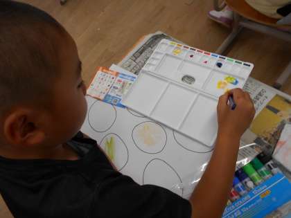 今日は先日に続いて、絵の具を使って色を塗ってみました。2色以上の色を混ぜて、きれいな色を作ってみました。パレットに色を出し、少しずつ混ぜることを意識して混色しました。丁寧に色を塗ることができましたね。