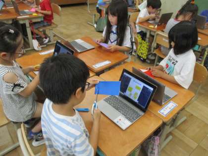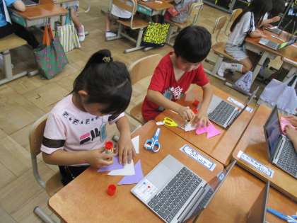 タブレットで七夕飾りのつくり方を見ながら友だちと一緒につくりました。