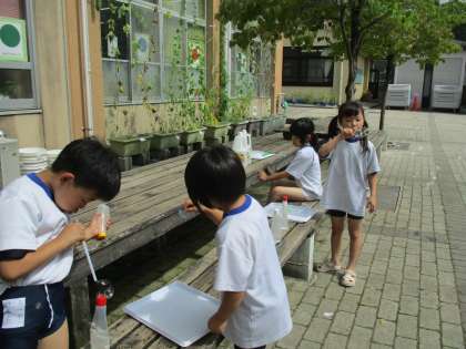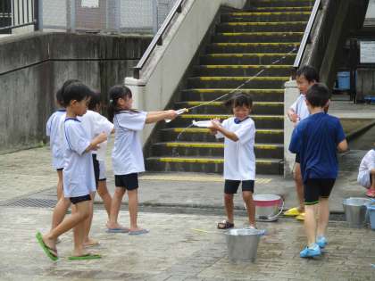 【1年】生活「なつと ともだち」 公開日 2024/07/15 更新日 2024/07/15 学校の様子 中庭で水あそびをしました。 冷たい水のかけ合いっこをしたり、水をどこまでとばせるか競争したり、 水鉄砲で的をねらったりしました。 このほかにもシャボン玉でも楽しみました。 「たのしい!」「きもちいい!」「また、やりたい!」とニコニコの子ども達でした。
