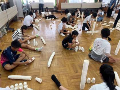 【6年】「実感と協働」醍醐小学校×成安造形大学(1) 公開日 2024/07/19 更新日 2024/07/19 学校の様子 成安造形大学の方に来ていただき、特別授業を行っていただきました。 紙コップを使って、誰がどれだけ高く積むことができるか…必死な様子の子どもたち!