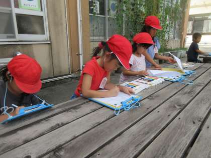 きれいなお花やみどりのもの、みんなにしらせたいひみつなどを見つけました。