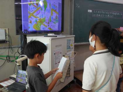2年生はハートフルウォークラリーで、参観日の日に学習した「見えるとか見えないとか」の学習についてを他の学年の人に聞いてもらいました。