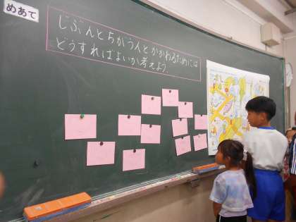 グループで、目の見えない人の立場になって、どんなことをヒントに歩いているかを考えることができました。