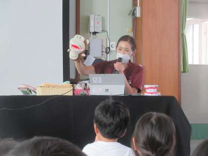 歯ブラシを持って、どのように歯を磨けばいいか学習しました。