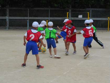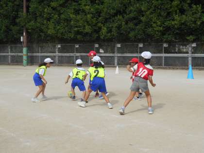 ボールけりゲームの学習をしています。まずは、ルールになれるところから始めています。最初はなかなかボールに触れなかった子も、2回目の今日は触れるようになってきました。これから、チームで勝てるために作戦をたてながらゲーム楽しんでいきたいと思います。