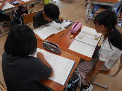 がまくんとかえるくんの言ったことやしたことの中で、心に残っていることを出し合い、その時に自分ならどうするか、どう言うかを考えました。自分の体験や経験が登場人物と重なると面白いですね。