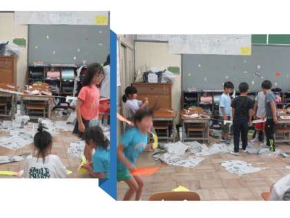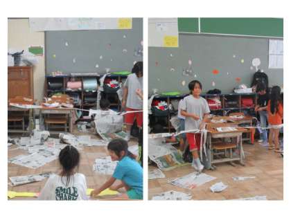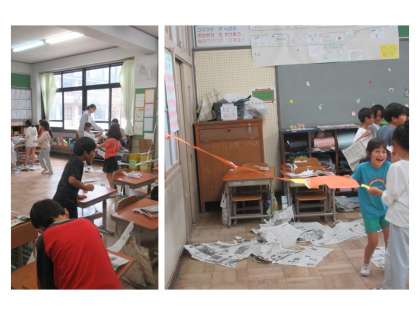 家の屋根のようにつないだり、アスレチックのようにつないだり、高い場所につないだり、ひらひらと細くちぎったものをつないだり…。