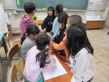 生活科の「あそんでためしてくふうして」で作ったおもちゃを、1年生にも遊んでもらいたいということになりました。そこで、きずなタイム(昼休み)の時間に、1年生を招待して「おもちゃで遊ぼう会」をしました。