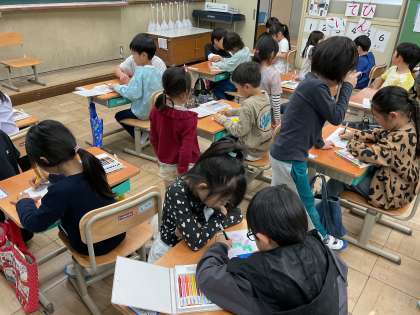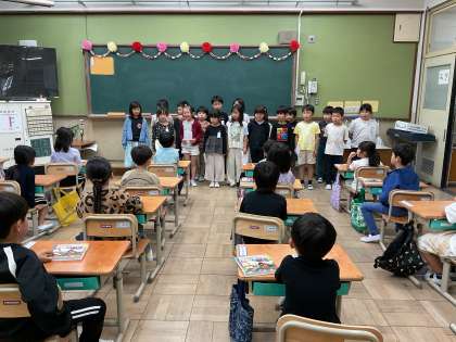 明日は、1年生と2年生が一緒に学校探検をします。それに向けて、2年生が招待状を持って来てくれました。一緒にお話しをしたり、塗り絵をしたりしました。明日一緒に回るのが楽しみになりましたね。