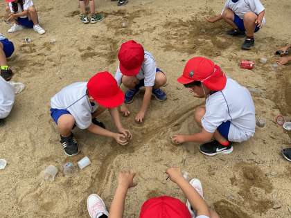 砂場で、すなや土の感触を楽しみました。カップを使って型抜きをしたり、掘って水を流してみたりしてたくさん遊びました。