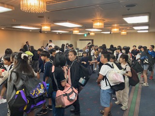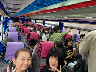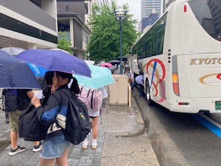 予定通りにホテルを出発しました。雨は降っていますが、みんな元気です!