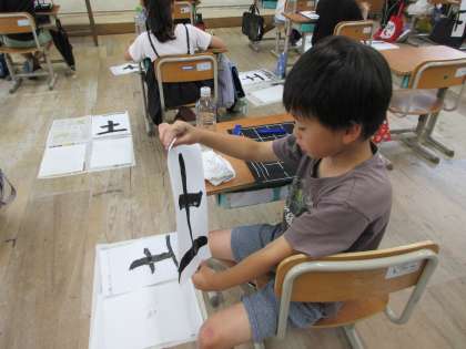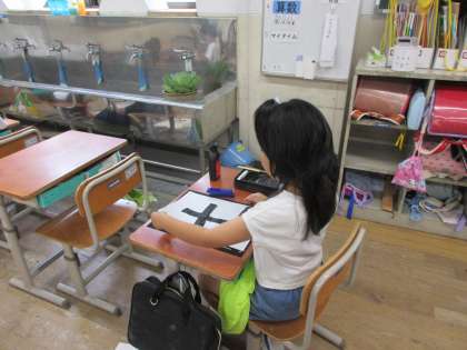書写の学習で、筆を使い書き始めています。今日は、縦画の筆使いに気を付けて「土」を書きました。一人ひとりゆっくり丁寧に取り組んでいます。