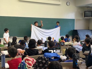 琵琶湖青少年の家に着き、入所式を行いました。青少年の家の方から、大切にして欲しいことやシーツの使い方を教えていただきました。