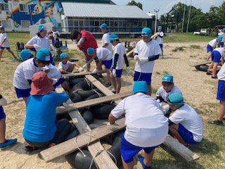 教えていただいたロープの結び方でタイヤや板を繋いでいきます。