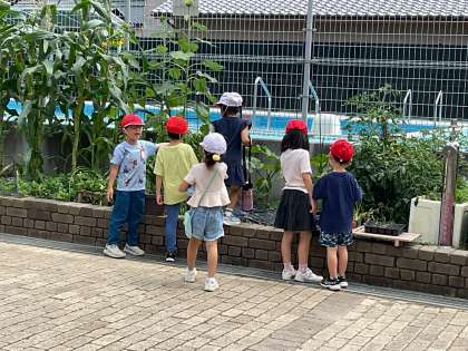 今日はなつみつけをしました。水分補給をしながら、短時間で行いました。夏の野菜や植物を見たり、鉄棒や遊具を触ってみたりして夏を感じました。