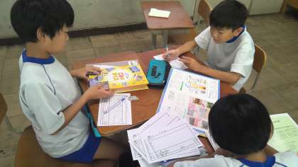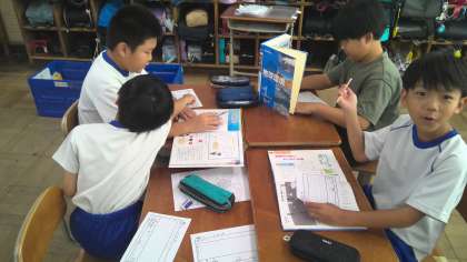 自分たちが立てた問いの答えを探し,ページをめくって,情報カードに書き込んでいました。