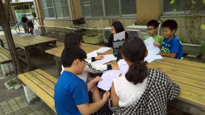 中庭のウッドくんにタブレットを立てて,自分たちの発表風景を動画に取って,チェックをしていきます。