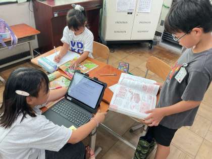 生きものを飼うためには、どんな環境をつくらないといけないのか、どんな食べ物を食べるのか、どこにいるのかなどを、本やタブレットを活用し調べていました。