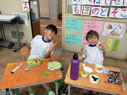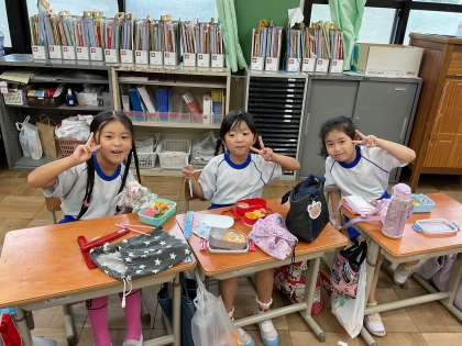 小学校生活でのはじめての運動会が終わりました。お昼はお家の方に作っていただいたお弁当をいただきました。朝早くからありがとうございました。みんなでおいしくいただきました。今日の楽しかった思い出を、たくさんお家で聞いてくださいね!