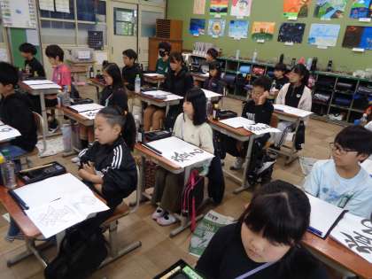 【5年】毛筆書写「登る」 公開日 2025/10/22 更新日 2025/10/22 学校の様子 漢字と平仮名の大きさに気をつけて書きました。平仮名は、漢字よりも小さめに書くとつり合いがとれます。次の時間は、自分の作品と向き合い、ふりかえりをまとめます。また、友だちの作品を鑑賞し合う中で、字形のとり方や筆使いにおけるポイントについて交流します。