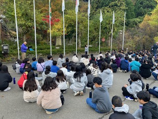 おはようございます。山の家3日目が始まりました。今朝は、一緒に宿泊した3校の合同朝の集いがあり、学校紹介をしました。