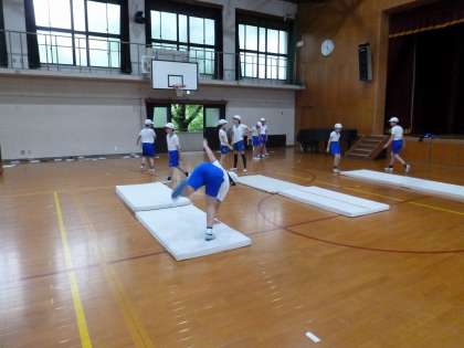 体育でマットの学習を続けていました。側方倒立回転やロンダート,前方倒立回転など少し難しい技にも挑戦することができました。