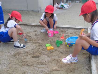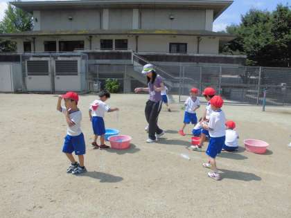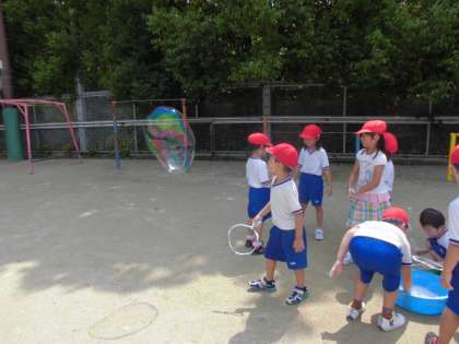 お家から持ってきた空き容器などで水遊びをしたり,砂遊びで山やダムを作ったり,いろいろなシャボン玉を作ったりと楽しみました。
