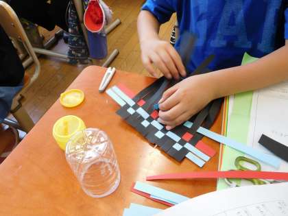 図工の学習で「アミアミアミーゴ」という題材に取り組んでいます。紙やひもなどを編んだり織ったりして作品を仕上げていきます。子どもたちは黙々と夢中で取り組んでいます。