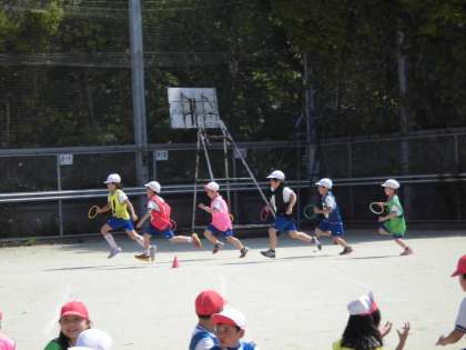 リレー遊びでは,後半はコーナーを走る練習を取り入れました。スピードを少しだけ落としたら走りやすいことや,直線では思い切り走り切ることなどを回数を重ねて上手にできるようになりました。チームで走順やバトンの渡し方を練習して,毎回順位が変わるといった楽しい結果になり,大変盛り上がりました。