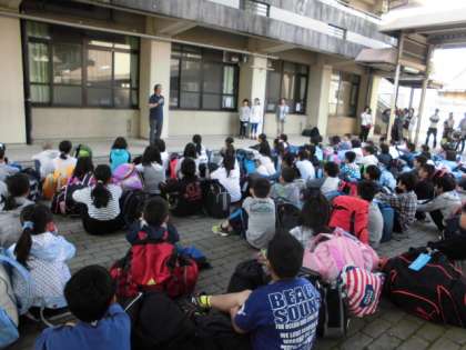 長期宿泊学習・1 公開日 2017/05/16 更新日 2017/05/16 5年生 待ちに待った5年生の一大イベント・奥越高原青少年自然の家での長期宿泊学習の日がきました。 5年生66名,欠席なく全員揃っての中庭での出発式です。さあ楽しい4日間のスタートです。順次活動の様子をアップしていきますので,楽しみにしておいてください。