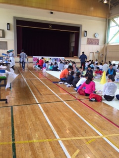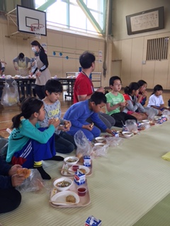 乾側小学校体育館で,乾側小学校全校児童との交流給食を食べました。