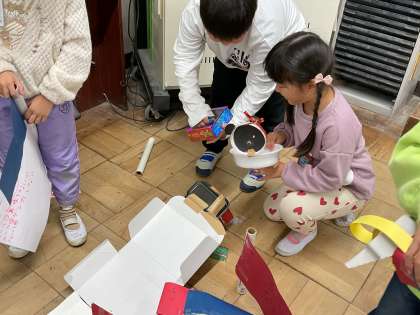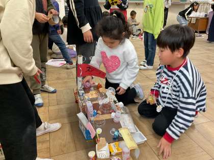 2年生が作ったおもちゃで遊ぶ会に招待してくださりました。オリジナルの楽しいおもちゃがたくさんあって、みんなで楽しみました。
