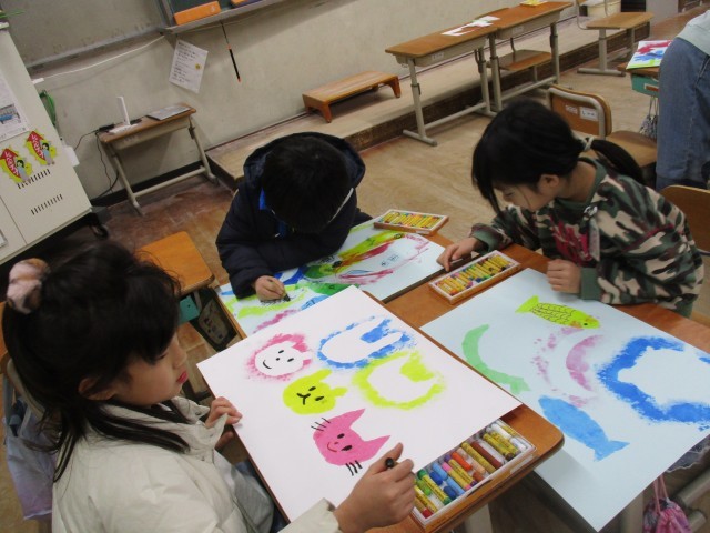 インクでうつした形の上に、絵を描き加えて作品が完成しました。