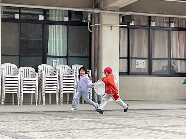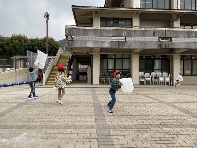 今日は先週作った風車やかざわで遊んでみました。それに加えて、大きな袋に風を入れて、とばしてみたり、走って風を集めたりしてみました。寒い中でしたが、みんな楽しそうに活動していました。