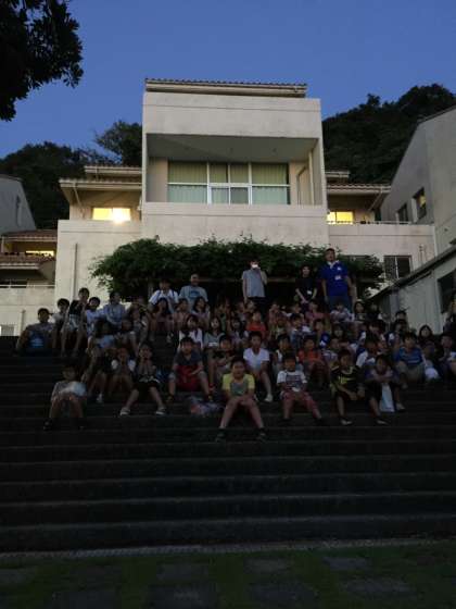 海の家の階段で,みんなで集合写真を撮りました。
