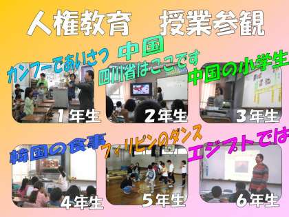 22日に人権教育の授業参観と,全校児童と保護者を対象にした「多文化のつどい」を行いました。「多文化のつどい」は本校の人権教育の一環で実施している多文化共生を目指して計画しました。いろいろな国の文化の違いを理解し,お互いを尊重しあえるようになろうと取り組んでいます。授業参観の後で,全校児童と保護者・地域の方に見ていただきました。