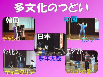 まずはじめに,韓国の演奏家によるチャンゴの演奏を聴きました。音楽だけでなく,見ていても目が吸いよせられる感じで,チェ(ばち)さばきのすごさに感動しました。次に,エジプトの歌を聞かせていただきました。最近の歌は楽しくて,自然と体が動き出しそうな感じでした。フィリピンのバンブーダンスは正しくは「ティニクリン」といって鳥の名前からつけられたそうです。舞台の上で,とても楽しそうに踊ってくださいました。中国からは武闘家の方が来られ,カンフー(中国拳法)の型を披露してくださいました。まるでテレビか映画をいているようでした。最後には日本の代表として,本校の教職員が「豊年太鼓」を演奏しました。豊年(豊かな成長)を願って心をひとつに打ちました。新聞社の取材もありました。