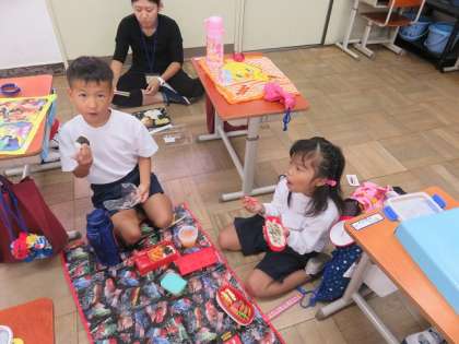 お弁当をみんなで楽しく食べます。朝早くから,ご準備ありがとうございました。
