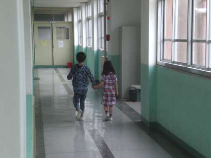2年生が1年生と手をつないで,学校の中を案内していました。